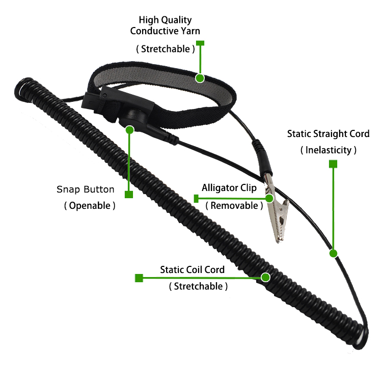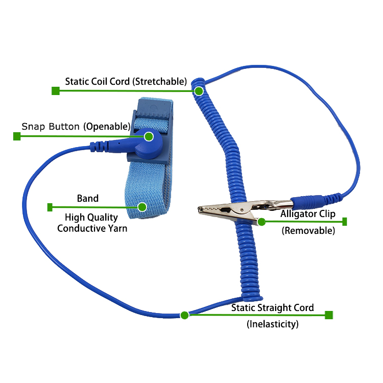 Káblový remienok na zápästie Efektívne vyváža ľudskú statickú elektrinu na zem cez remienok na zápästie a uzemňovací drôt, aby sa zabránilo poškodeniu statickej elektrickej energie v poškodení citlivých elektronických komponentov. Tento proces zaisťuje bezpečnosť a spoľahlivosť prostredníctvom stabilného odporu.